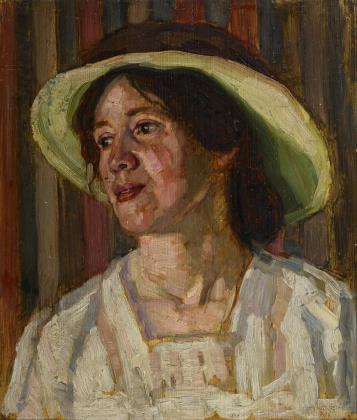 Bildnis einer Frau mit Hut vor neutralem Hintergrund