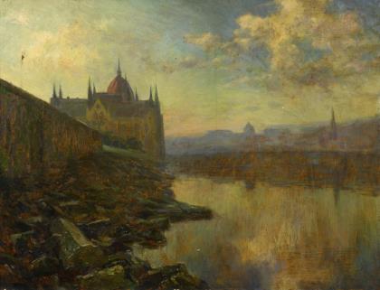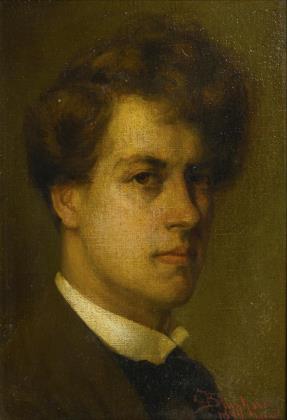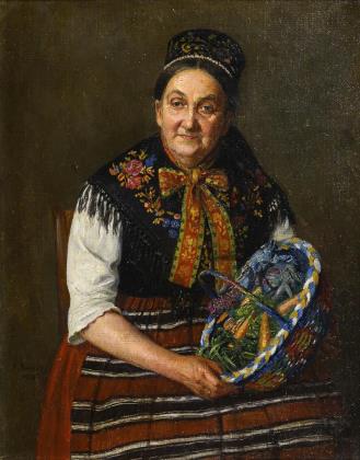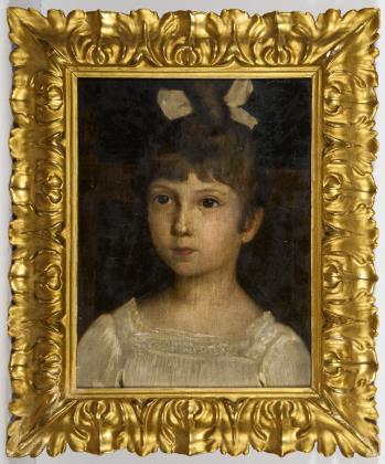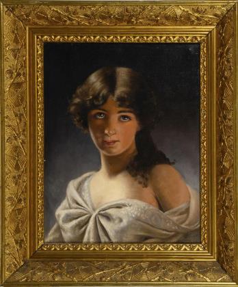 Ungarischer Maler (1844 Munkács - 1900 Endenich). Porträt mit einem wirkungsvollen Kolorit im Kontrast von leuchtendem Cremeweiß und samtigen Schwarzbraun. Bezeichnet und datiert, rückseitig undeutliches Siegel. Breiter geschwärzter Rahmen mit goldener Flammleiste