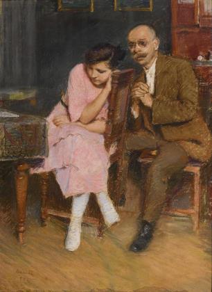 Szene aus der Komödie "Diebe und Liebe" (auch: Ein besuchter Platz) von Alexander Nikolajewitsch Ostrowski 1865. Bezeichnet. Ohne Rahmen