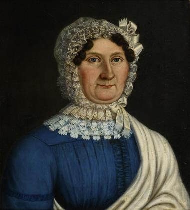 Porträt einer älteren Frau im blauen Kleid mit Spitzenhaube