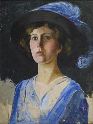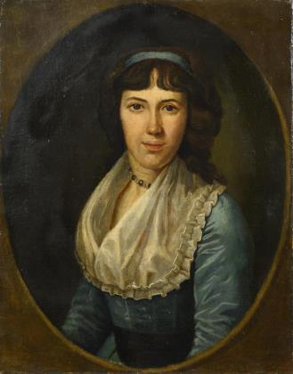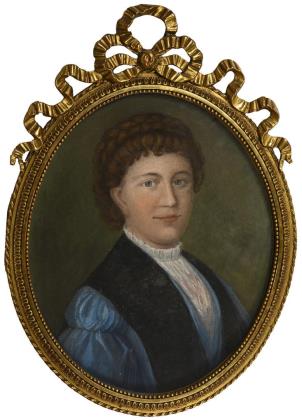 Porträt einer jungen Frau im blauen Kleid mit Haarband und im gemalten ovalen Bildausschnitt