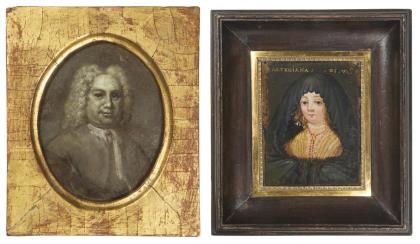 Zwei Bildnis-Miniaturen: Herrenporträt mit Perücke und Damenporträt mit Schleier.