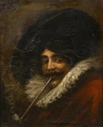 Verschmitzt zum Betrachter blickender Mann mit langstieliger Pfeife in der Kleidung des 17. Jh
