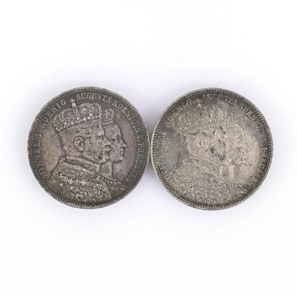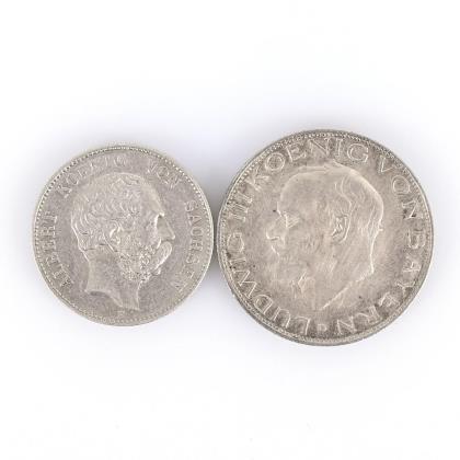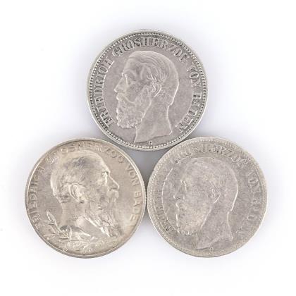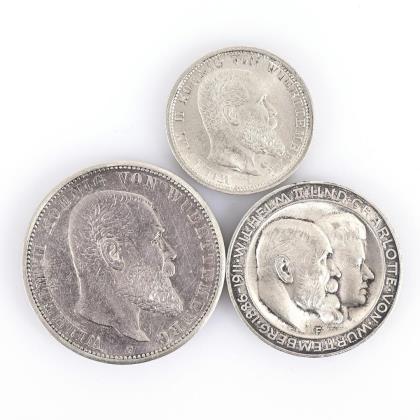 5 Mark, 1893, "Wilhelm II Koenig von Württemberg". / 3 Mark, 1911, "Wilhelm II und Charlotte von Württemberg 1886-1911". / 2 Mark, 1912, "Wilhelm II Koenig von Württemberg". Alle nach rechts blickend