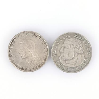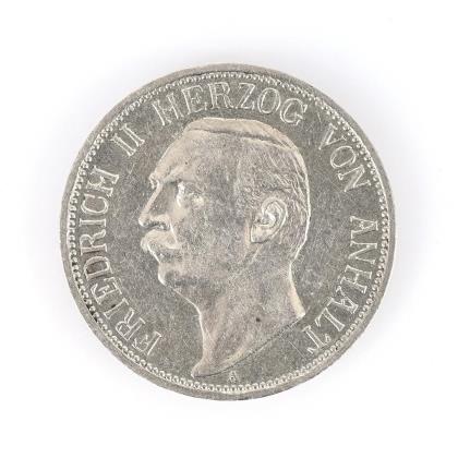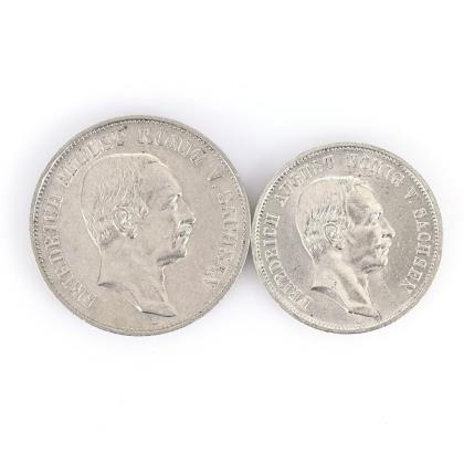 5 Mark, 1907, "Friedrich August König v. Sachsen" / 3 Mark in gleicher Ausführung, 1909. Randumschrift