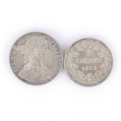 1 Gulden, Frankfurt, 1838, "Freie Stadt Frankfurt". / "Ein Vereinsthaler, XXX Ein Pfund Fein", "Freie Stadt Frankfurt" mit Damenporträt, nach rechts blickend