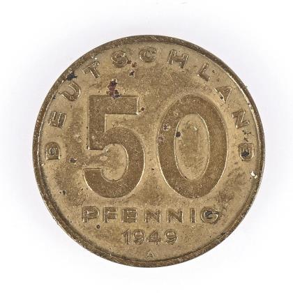 Probeprägung der am 1. September 1950 in der DDR in Umlauf gekommenen Münze. "Deutschland, 50, Pfennig, 1949, A", Revers: Pflug vor Industrieanlage. Münzstätte Berlin. Rand mit Arabesken