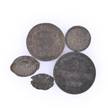 2 Pfennig Scheidemünze, 1867, "Herzogthum Sachsen-Meiningen. / 2 Grossus (Groschen), 1756, "II Grossus Regni Pruss 1756", "Fredericus Borus: Rex", Prägeort E Königsberg / arabische Kleinmünze / 2 stark abgegriffene Kleinmünzen mit kyrillischer Schrift