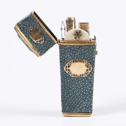Messing-Bronze, vergoldet, Perlrochenleder. Köcherförmiger Korpus mit Scharnierdeckel, Druck-Knopf und fünf Reise-Utensilien. Umlaufend vier applizierte Kartuschen
