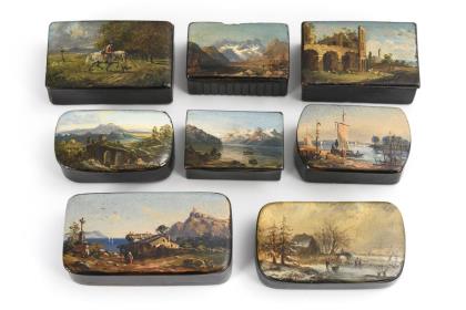 Sammlung von acht Lackdosen mit Landschaftsmalerei.