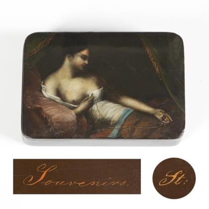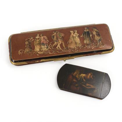 Brillenetui: Verführung des jungen Mönches bzw. Damenporträt. / Schatulle mit märchenhaften Szenen auf dem Deckel; innen ein Handschuhspanner