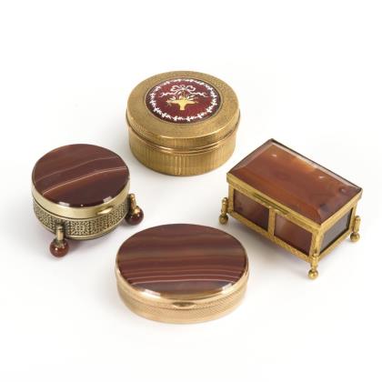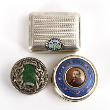 Alle drei Dosen mit Scharnierdeckel. Rechteckige Dose mit Feingehaltszeichen Niederlande 833er Silber, allseits Applikationen mit Perlmutt und farbigem Steinbesatz. Ovale Dose mit graviertem Deckel, rückseitig mit reliefiertem Muscheldekor