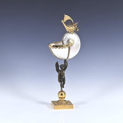 Großer Kunstkammer-Pokal mit vollplastischer Amorfigur auf der Kugel, der mit erhobenem Arm die Nautilusschale trägt; als Bekrönung ein Segelschiff