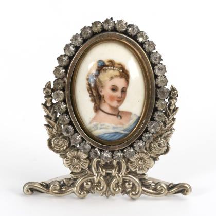 Der Standrahmen mit Rosen und Rocaillen hält den drehbaren Strassrahmen mit der Porzellanminiatur einer Schönheit