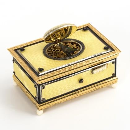 Quaderdose allseits und auf dem Deckel mit emaillierten Zierplatten belegt; Scharnierdeckelrelief mit Vögeln, 1 Schieberegler. Unter dem Deckel hochklappender Vogel aus bunten Federn