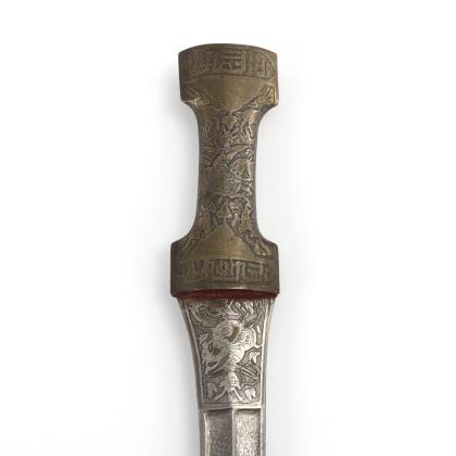 Gebogene Klinge, die in der Spitze mehrfach geteilt ist und beim Ziehen aus der Scheide aufspringt. Klingenoberfläche in der Art eines Damaszenermusters. Fehlschärfe mit Ätzrelief eines Reiters. Griff und Scheide einheitlich aus Eisen mit Reiter- und Jagdszenen im Flachrelief und Koftgari-Technik. Auf jeder Seite drei Kartuschen mit Schriftzeichen