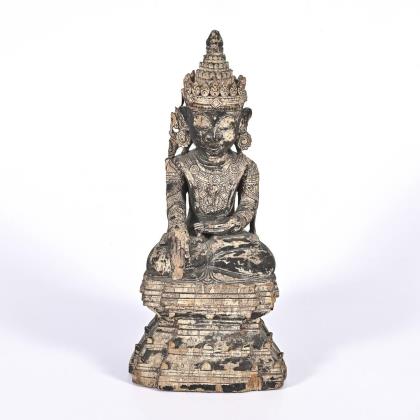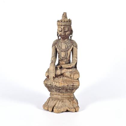 Sehr fein geschnitzte Figur, teils verwittert. Buddha mit der Geste der Erdberührung, in reich verzierter Bekleidung, mit Ohrringen und Kopfschmuck