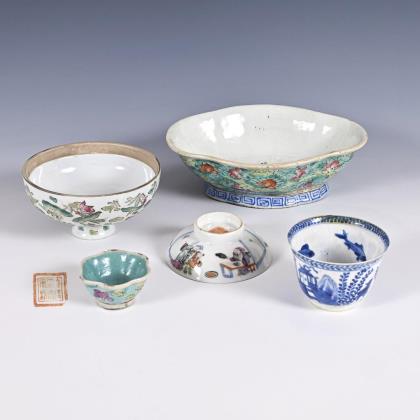 Ovale Schale aus dickem Porzellan, gemarkt. Innen unregelmäßig verarbeitete Glasur mit blauen Punktmustern. 6 x 19 x 14 cm. / Deckel, der auch als Schale zu verwenden ist. Als Dekor Seerosen und Reiher. H 6, Ø 12 cm. / Flache Schale mit figürlichem Außendekor, gemarkt. H 3, Ø 9 cm. / Hohe Schale aus dünnem Porzellan in Unterglasurblau. Innen Fischdekor, außen Haus und Pflanzen. Durchgehender Haarriss und Randrestaurierung. H 6 cm. / Sehr kleines Schälchen mit gewelltem Rand. Emailmalerei. Innen einfarbig grün, außen Blütenmuster. Ränder mit alten Chips. H 3 cm