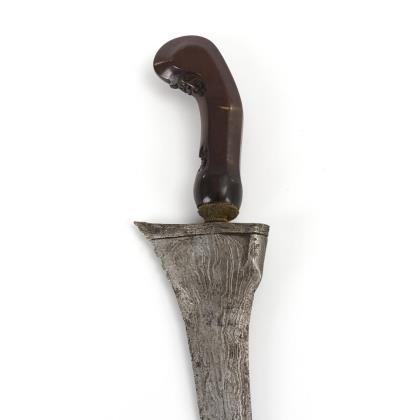 Gerade Klingenform mit ausgepägtem pamor. Planarer Holzgriff mit geschnitzten patra-Verzierungen. Holzscheide mit gravierter Messingfassung. In der wrangka kleine Maserungslöcher