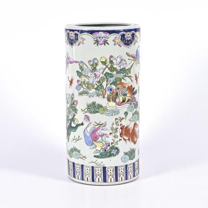 Zylindrische Form mit kleinem, geradem Inennrand. Wasserpflanzen, Fische und Enten in polychromer Emailbemalung