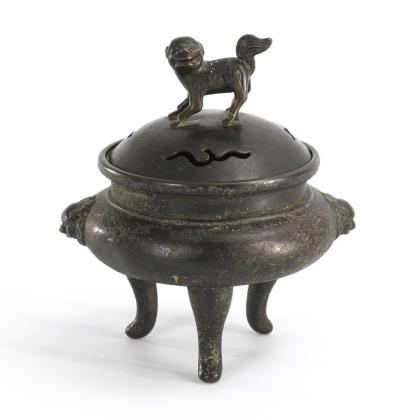 Dreibein, schlichter Korpus mit stilisierten Masken-Handhaben. Durchbrochen gearbeiteter Deckel mit Tierknauf