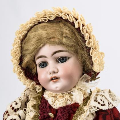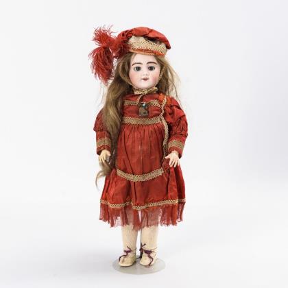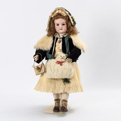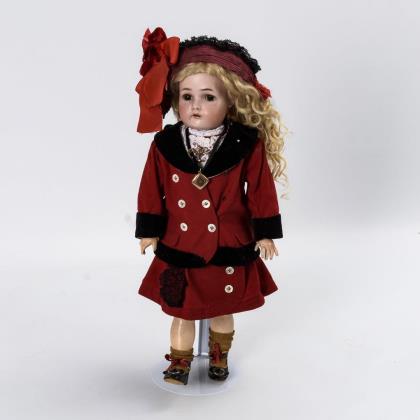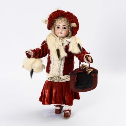 Kurbelkopf, braune Schlafaugen, Ohrringe, blonde Mohairperücke. 15-teiliger Gliederkörper. Rotes Samtkleid, passender Schutenhut, Hermelin-Schal und -Muff, rote Wachstuchschuhe
