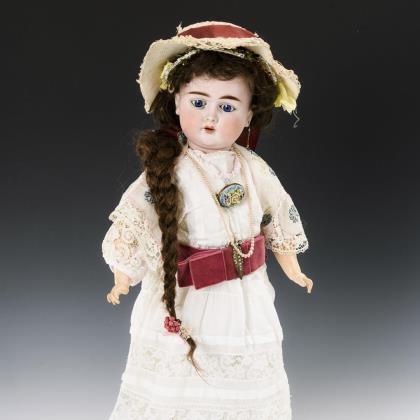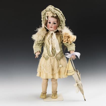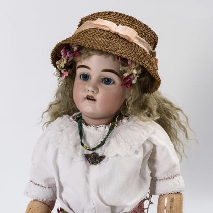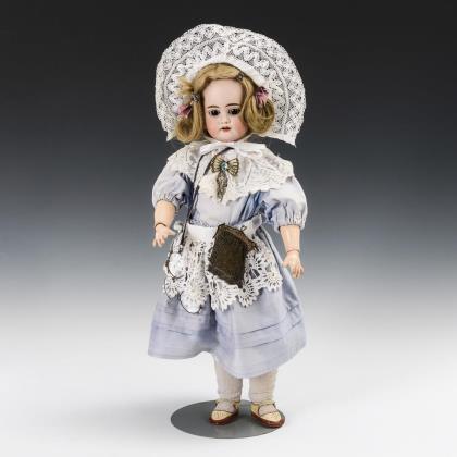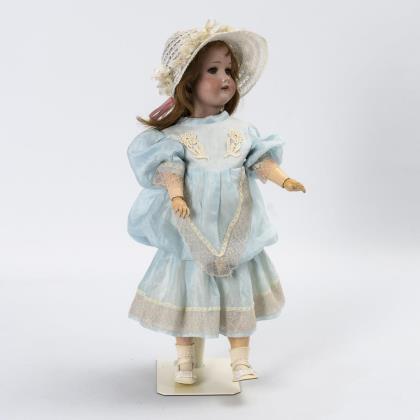 Drehbarer Kurbelkopf, blaue Schlafaugen, Wimpern, blonde Echthaarperücke. 11-teiliger Laufpuppenkörper mit intaktem Mechanismus und Stimme. Hellblaues Seidenkleid, weiße Schuhe, weißer Strohhut