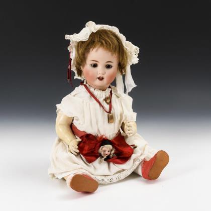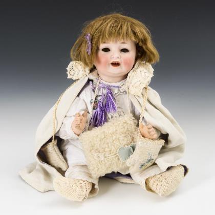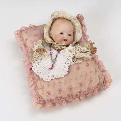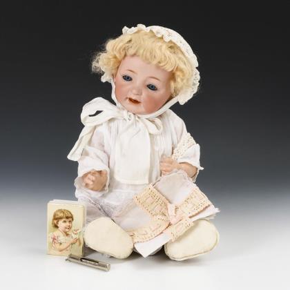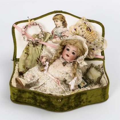 Kurbelkopf, blaue Schlafaugen, Wimpern, blonde Mohairperücke mit Zöpfen. 5-teiliger Sitzbabykörper. Weißes Kleid mit rosa Schleifchen, Wachstuchschuhe. L 25 cm. Grüne Plüsch-Schatulle mit gestickter Aufschrift "Cravatten"; darin Kleidchen und etwas Zubehör