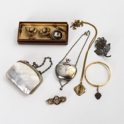 Goldfarbener Armreif, Jugendstil-Miniaturbörse, Perlmutt-Börse, Kette mit Anhänger, 2 Broschen und 3 (Manschetten-)Knöpfe mit Kinderbildern