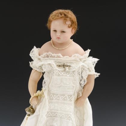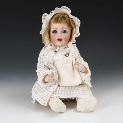 Brustkopf, blaue Schlafaugen, geschlossener Mund, einzeln eingestochene Echthaare. Stoffkörper mit Wachsgliedern. Langes weißes Taufkleid, Häubchen