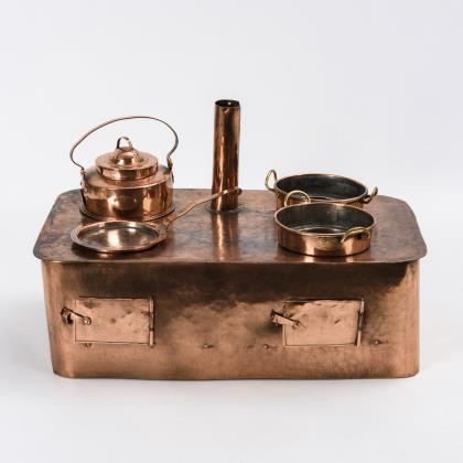 Handgetriebener Kinderherd mit 2 Kupfertöpfen, Pfanne, Wasserkessel und 2 Brennern
