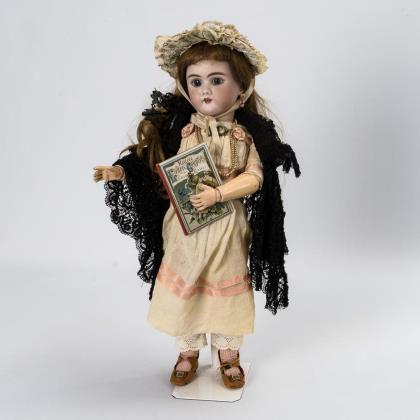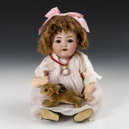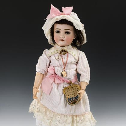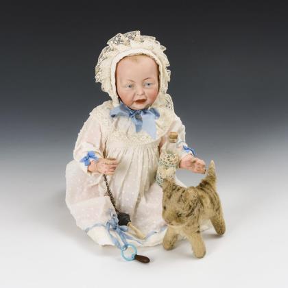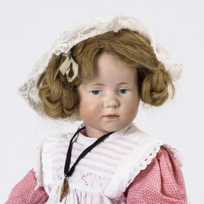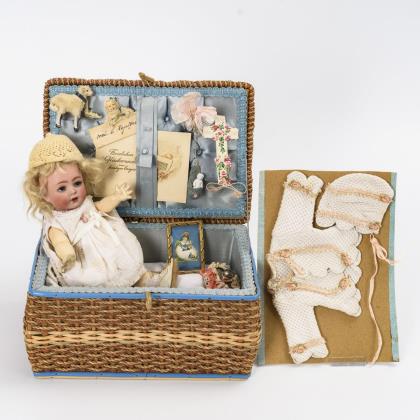 Kurbelkopf, leicht eingefallene braune Schlafaugen, braune Mohairperücke. 5-teiliger Stehpuppenkörper, zartrosa Kleid, alte braune Wachstuchschuhe. L 40 cm. Dazu Aufsatz eines Hochstuhls (H 35 cm), Henkelkörbchen und Pappschachtel mit Gebetsbüchlein und kleiner Babyrassel