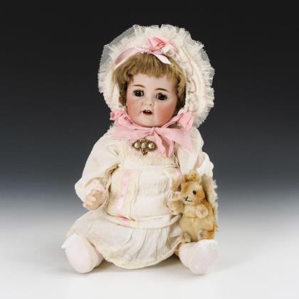 Brustkopf, braune Schlafaugen, blonde Mohairperücke, Lederkörper, Celluloidarme. Rosa Kleidchen mit weißer Spitze, Strohhut, weiße Lederschuhe (L 37 cm). Dazu kleine Nähmaschine mit Handkurbel und 2 glasierte Püppchen mit kleinen Bestoßungen (L 9,5/12,5 cm)