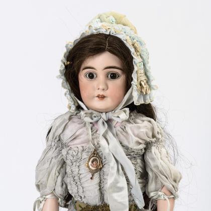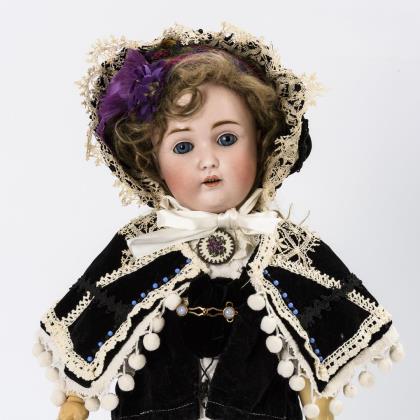Kopf mit fest vergipstem Deckel, feste braune Glasaugen, lange schwarze Echthaarperücke. Lederkörper mit Biskuit-Unterarmen. Hellblaues Kleid mit Perlstickerei-Gürtel, Jugendstilanhänger, Häubchen und alte schwarze Wachstuchschuhe