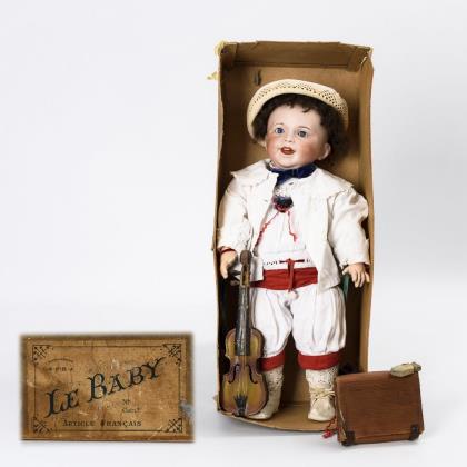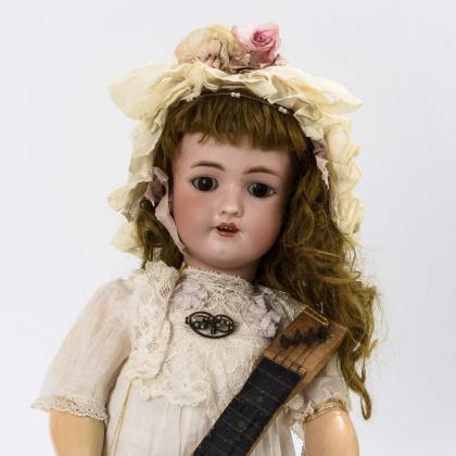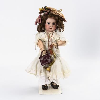 Kurbelkopf mit Korkdeckel, feste blaue Glasaugen, originale Ohrringe, braune Echthaarperücke mit Haarteil. 11-teiliger Gliederkörper mit originalem Etikett "Bébé Jumeau, Diplôme d'honneur". Weißes Kleid, Strohhut, Blumenkranz, braune Lederschuhe. Mit Horn, Musiktasche, alter Kette und Granatarmband, Ohrringen