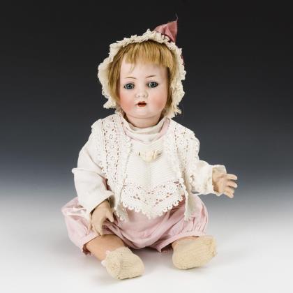 Kurbelkopf, braune Schlafaugen, Wimpernreste, blonde Mohairperücke mit blauen Haarschleifen. 5-teiliger Sitzbabykörper. Zartrosa Kleid, weißes Lätzchen, Haube
