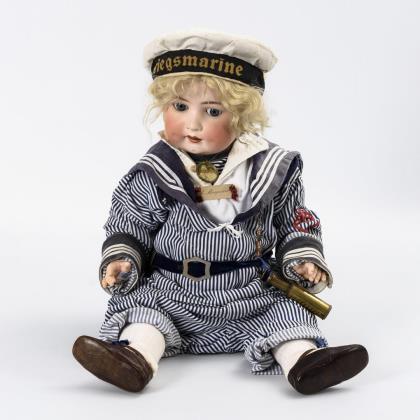 Kurbelkopf, verklemmte blaue Schlafaugen, bewegliche Zunge, blonde Echthaarperücke. 5-teiliger Sitzbabykörper. Weißer Anzug, Matrosenkragen, Pickelhaube aus Metall. L 34 cm. Dazu braunes Pferd mit blonder Mähne und Schweif, auf Räderplatte. H 40 cm