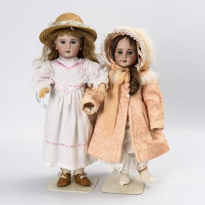 Beide mit Kurbelkopf, blauen Schlafaugen, Wimpern und 11-teiligem Gliederkörper. 1x blond mit weißem Kleid, 1x braunhaarig mit lachsfarbenem Mantel und passender Haube