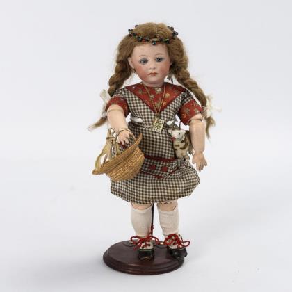Kurbelkopf, braune Schlafaugen, blonde Mohairperücke. 15-teiliger Gliederkörper. Kariertes Kleid, Schutenhut, Haarkranz