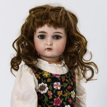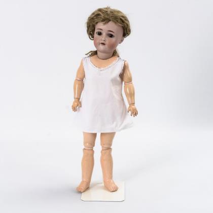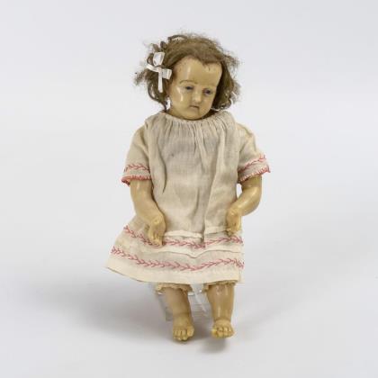Brustkopf, eingelegte blaue Glasaugen, braune Mohairhaare. Holzwollegestopfter Körper mit Wachsgliedern. Weißes Hemdchen