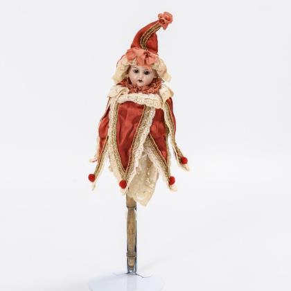 Brustkopf, feste braune Glasaugen, drehbarer Pappkörper mit intaktem Spielwerk an Drechselstab. Rot-weiße Kleidung im Harlekin-Stil