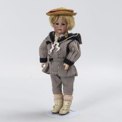 Kurbelkopf, blaue Augen, geschlossener Schmollmund, blonde Mohairperücke. 11-teiliger Toddlerkörper. Matrosenanzug, Strohhut und weiße Lederstiefelchen