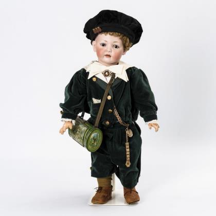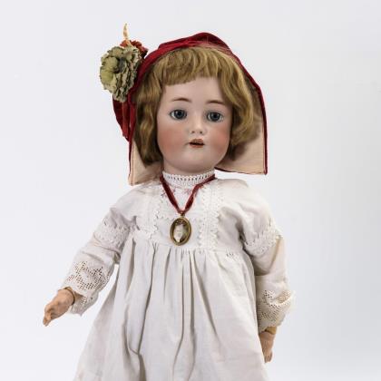 Kurbelkopf, braune Schlafaugen, Wimpern, modellierte Augenbrauen, Ohrringe, gelockte Mohairperücke. 11-teiliger Laufpuppenkörper mit Gliederarmen. Kostüm mit schwarzem Samtkragen und goldener Jugendstilbrosche, rote Haube, schwarze Wachstuchschuhe