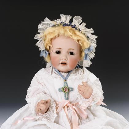 Kurbelkopf mit fest vergipstem Deckel, braune Schlafaugen, blonde Mohairperücke. 5-teiliger Sitzbabykörper. Weißes Taufkleid mit rosa Bändern, perlenbesticktes Häubchen, Kreuzanhänger aus Porzellan