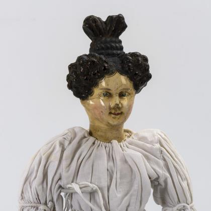 Brustkopf aus Papiermaché mit gemalten blauen Augen und außergewöhnlichem, herzförmigem Haarknoten. Stoffkörper mit Schlenkerarmen. Weißes Kleid, gestrickte Strümpfe, rote Stoffschuhe