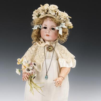 Kurbelkopf, braune Schlafaugen (etwas tiefliegend), Wimpern, geschlossener Schmollmund, blonde Mohairperücke. 15-teiliger Gliederkörper. Originales weißes Kleid, Häubchen, Blütenkranz und schwarze Lederschuhe