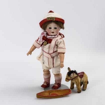 Kurbelkopf, blaue Schlafaugen, Wimpern, braune Echthaarperücke. 15-teiliger Gliederkörper, in rot-weißer Matrosenkleidung. Dazu Esel aus Kunstplüsch und kleines Holzboot
