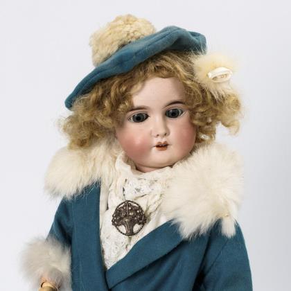 Kurbelkopf, blaue Schlafaugen, blonde Kunsthaarperücke mit Locken. 15-teiliger Gliederkörper. Blaues Kleid, Mantel und Hut mit weißem Pelzbesatz, weiße Wachstuchschuhe