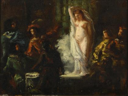 Studie mit mehreren Männern beim Betrachten einer jungen Frau mit antikisierendem Gewand