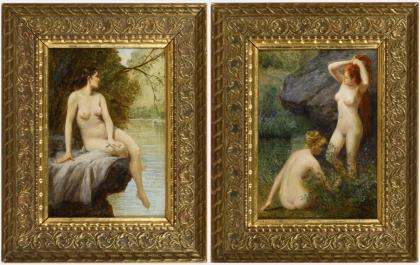 CAUCANNIER, Jean Denis Antoine (1860 Paris - 1905/6). Zwei Gemälde mit Frauenakten: "Akt auf Felsen" und "Nackte am Fluß".